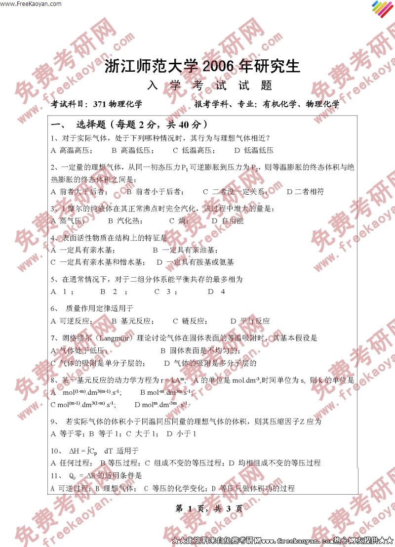 浙江师范大学2006年考研真题-物理化学