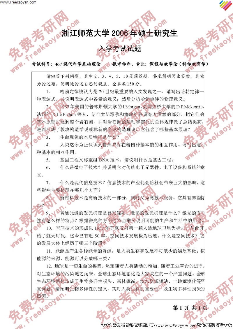浙江师范大学2006年考研真题-现代科学基础理论基础