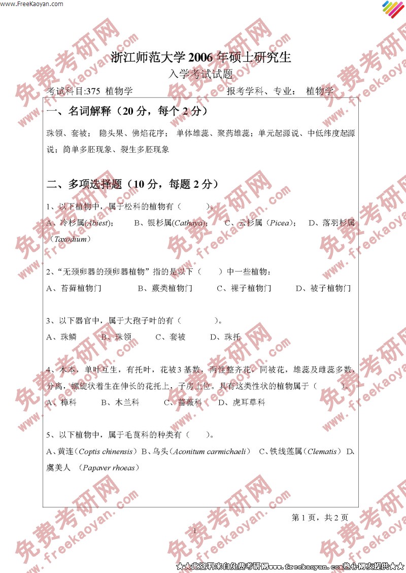 专业课考研经验 本站小编 FreeKaoyan 2018-01-22浙江师范大学2006年考研真题-细胞生物学