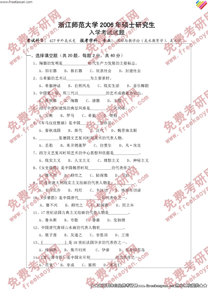 专业课考研经验 本站小编 FreeKaoyan 2018-01-22浙江师范大学2006年考研真题-艺术综合