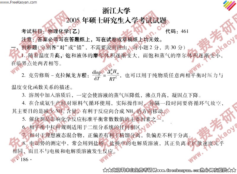 浙江大学2005年考研真题-物理化学甲