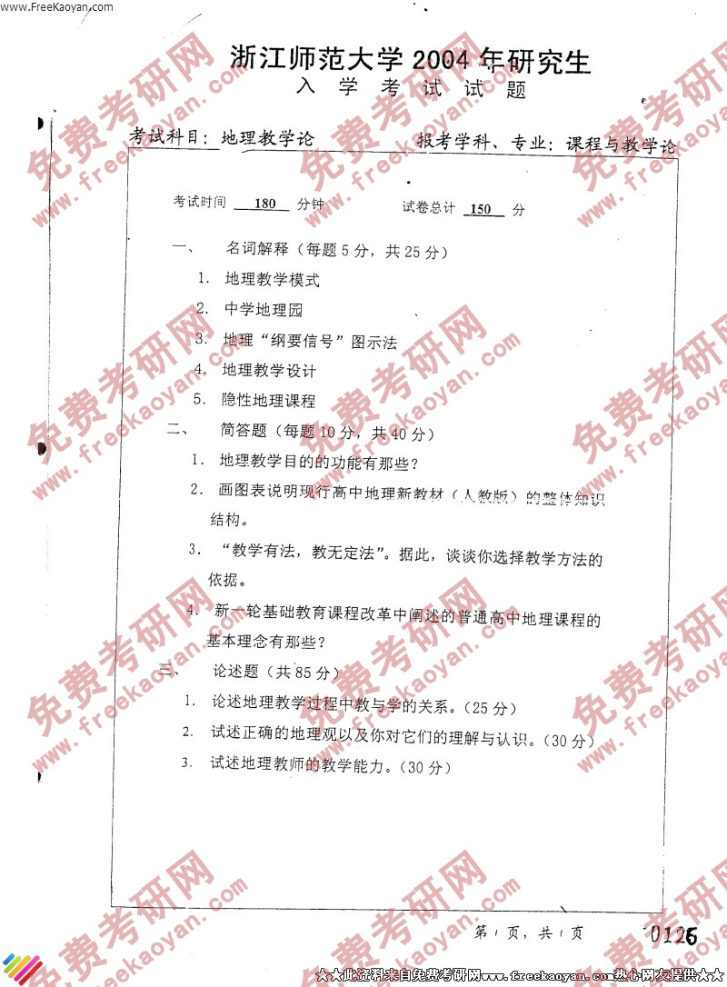 专业课考研经验 本站小编 FreeKaoyan 2018-01-22浙江大学2005年考研真题-物理化学甲