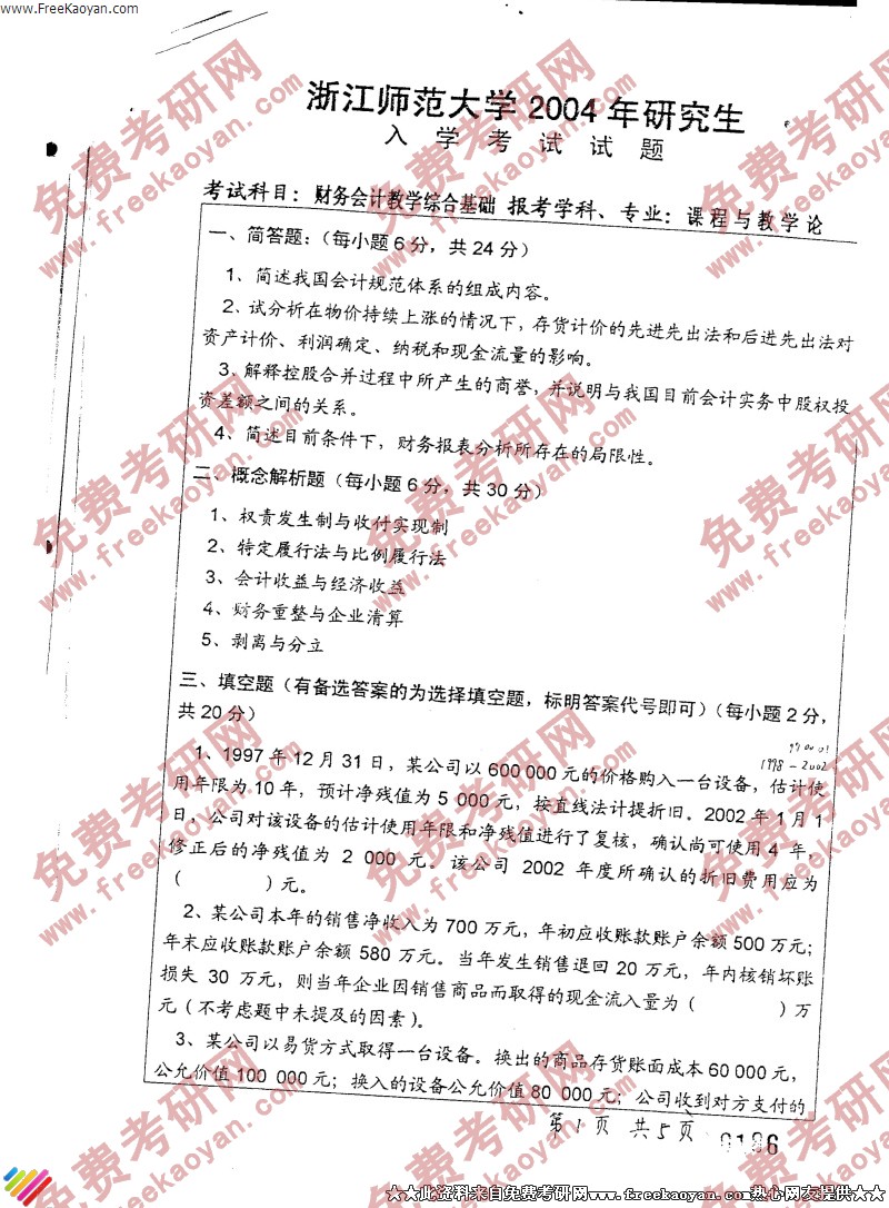 浙江师范大学2004年考研真题-财务会计教学综合基础