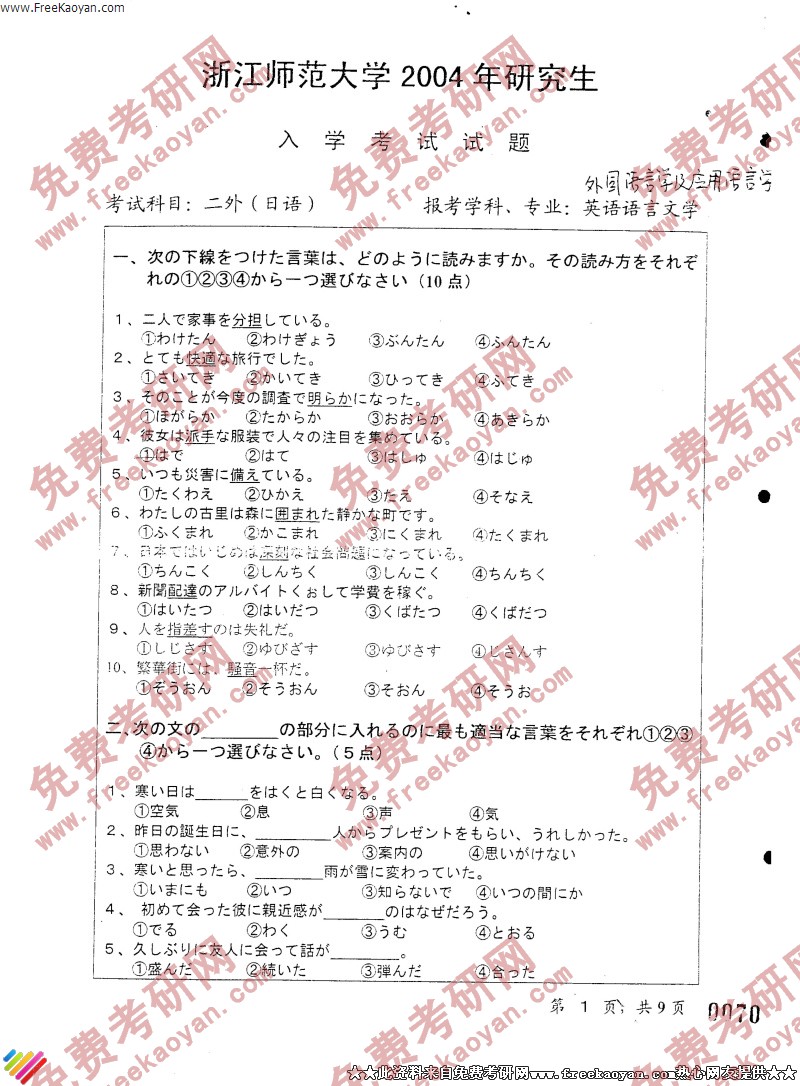 专业课考研经验 本站小编 FreeKaoyan 2018-01-22浙江大学2005年考研真题-日语语言与文学