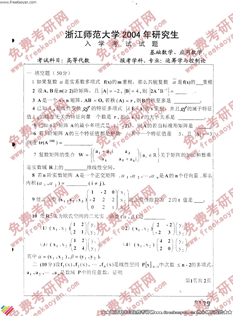 专业课考研经验 本站小编 FreeKaoyan 2018-01-22浙江大学2005年考研真题-物理化学乙2