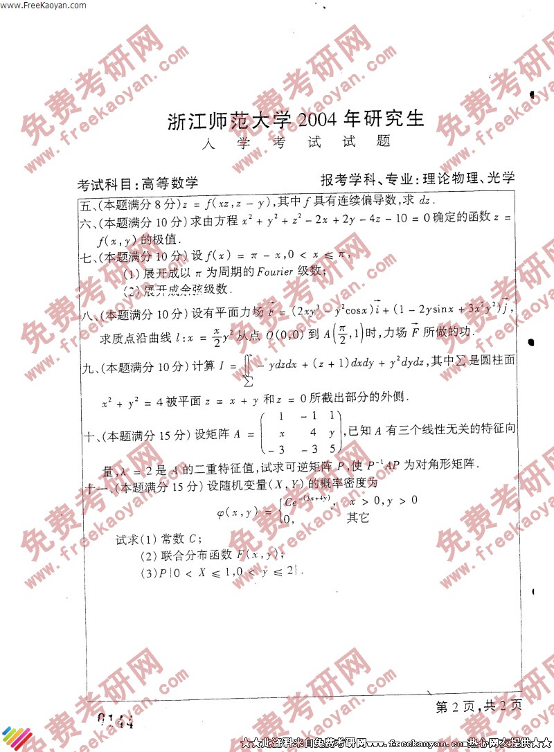 浙江师范大学2004年考研真题-高等数学(2)