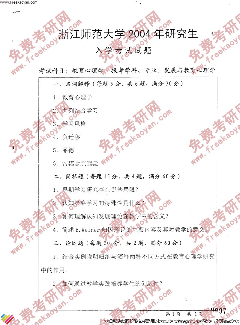 专业课考研经验 本站小编 FreeKaoyan 2018-01-22浙江师范大学2004年考研真题-教育技术学
