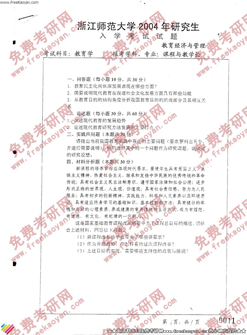 专业课考研经验 本站小编 FreeKaoyan 2018-01-22浙江师范大学2004年考研真题-教育管理学