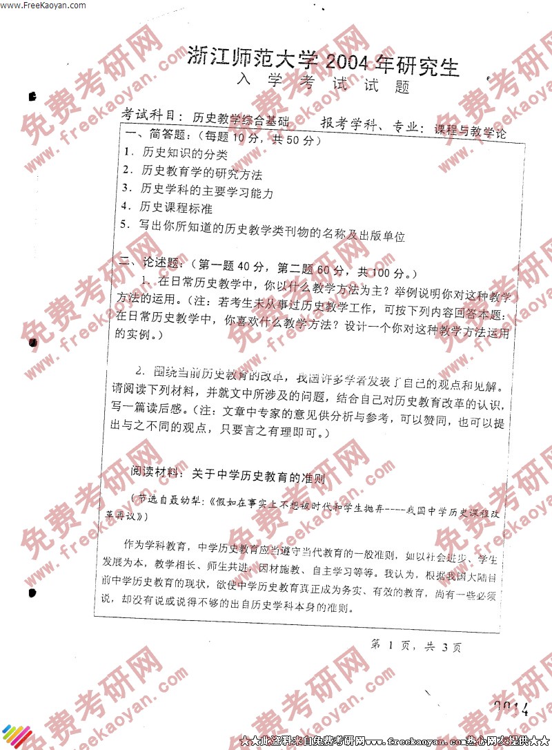 专业课考研经验 本站小编 FreeKaoyan 2018-01-22浙江师范大学2004年考研真题-教育学