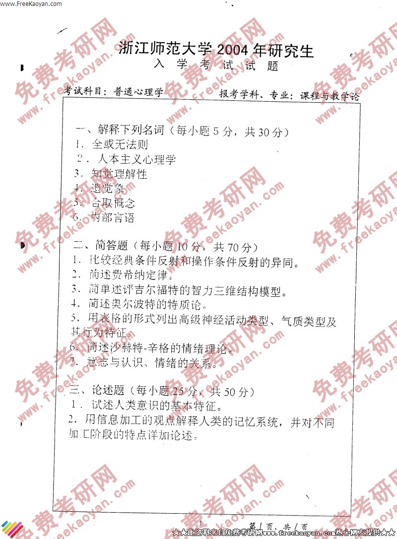 专业课考研经验 本站小编 FreeKaoyan 2018-01-22浙江师范大学2004年考研真题-教育学