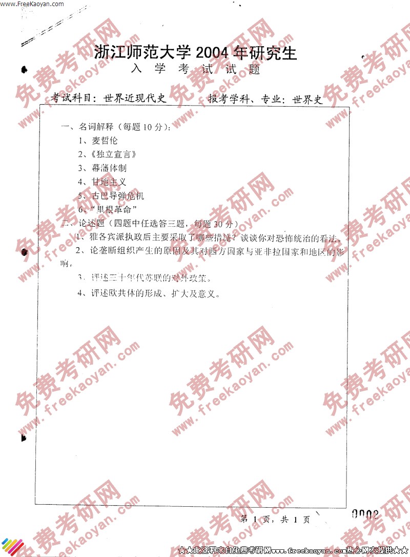 专业课考研经验 本站小编 FreeKaoyan 2018-01-22浙江师范大学2004年考研真题-历史教学综合基础