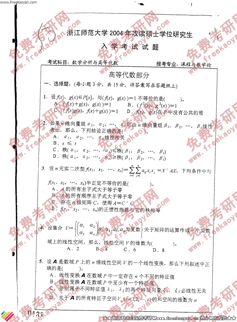 相关话题/考研真题 浙江师范大学 高等代数 数学分析