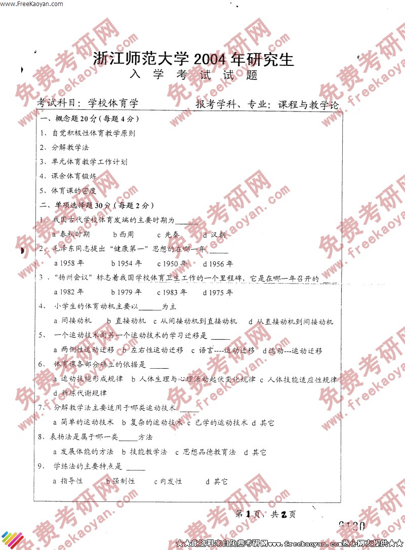 专业课考研经验 本站小编 FreeKaoyan 2018-01-22浙江师范大学2004年考研真题-体育概论