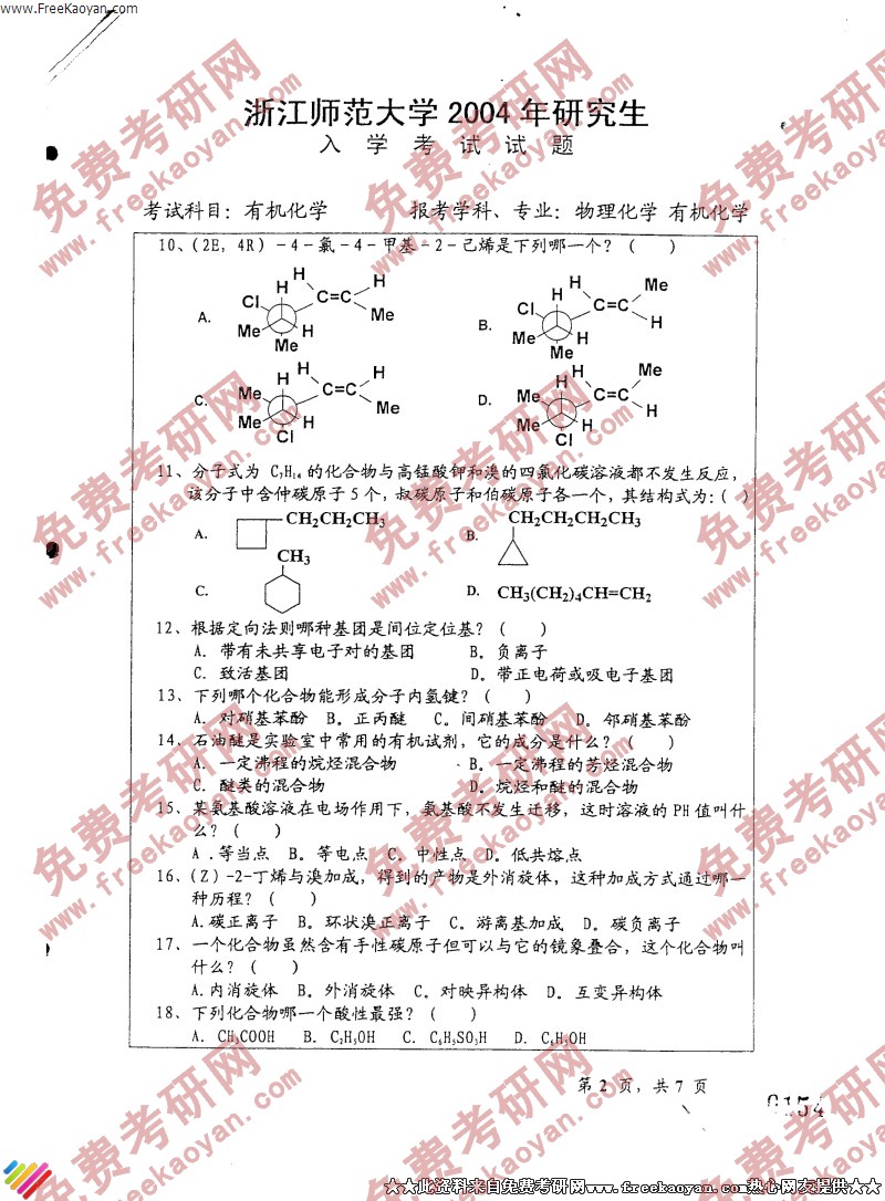 浙江师范大学2004年考研真题-有机化学(2)