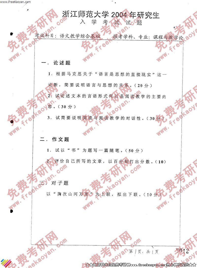 浙江师范大学2004年考研真题-语文教学综合基础