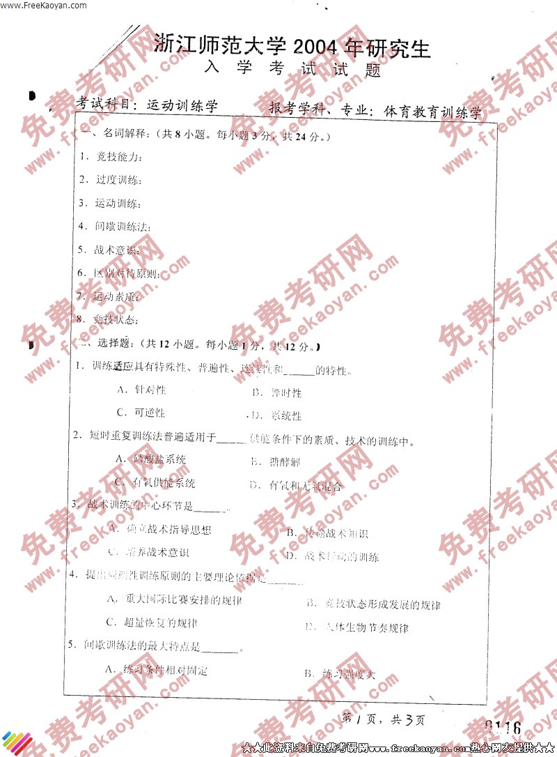 专业课考研经验 本站小编 FreeKaoyan 2018-01-22浙江师范大学2004年考研真题-体育概论