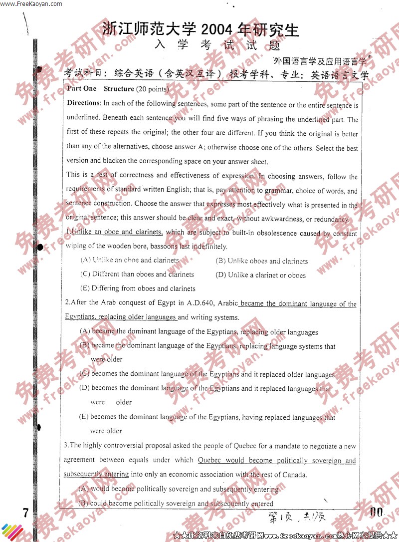 浙江师范大学2004年考研真题-综合英语(含英汉互译)浙江师范大学2004年考研真题-综合英语(含英汉互译)