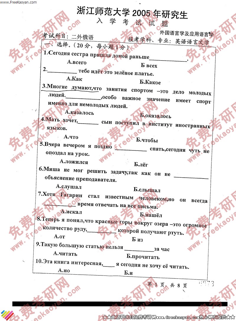 浙江师范大学2005年考研真题-二外俄语