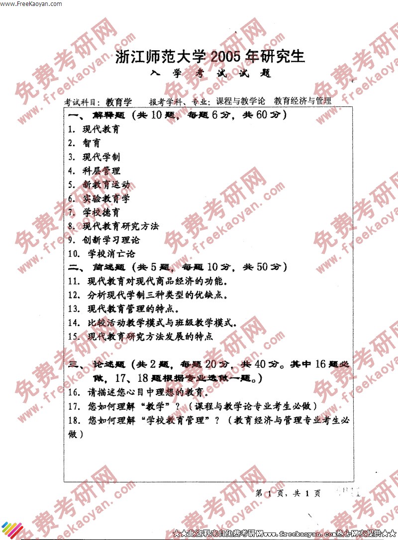 专业课考研经验 本站小编 FreeKaoyan 2018-01-22浙江师范大学2005年考研真题-化学教学论