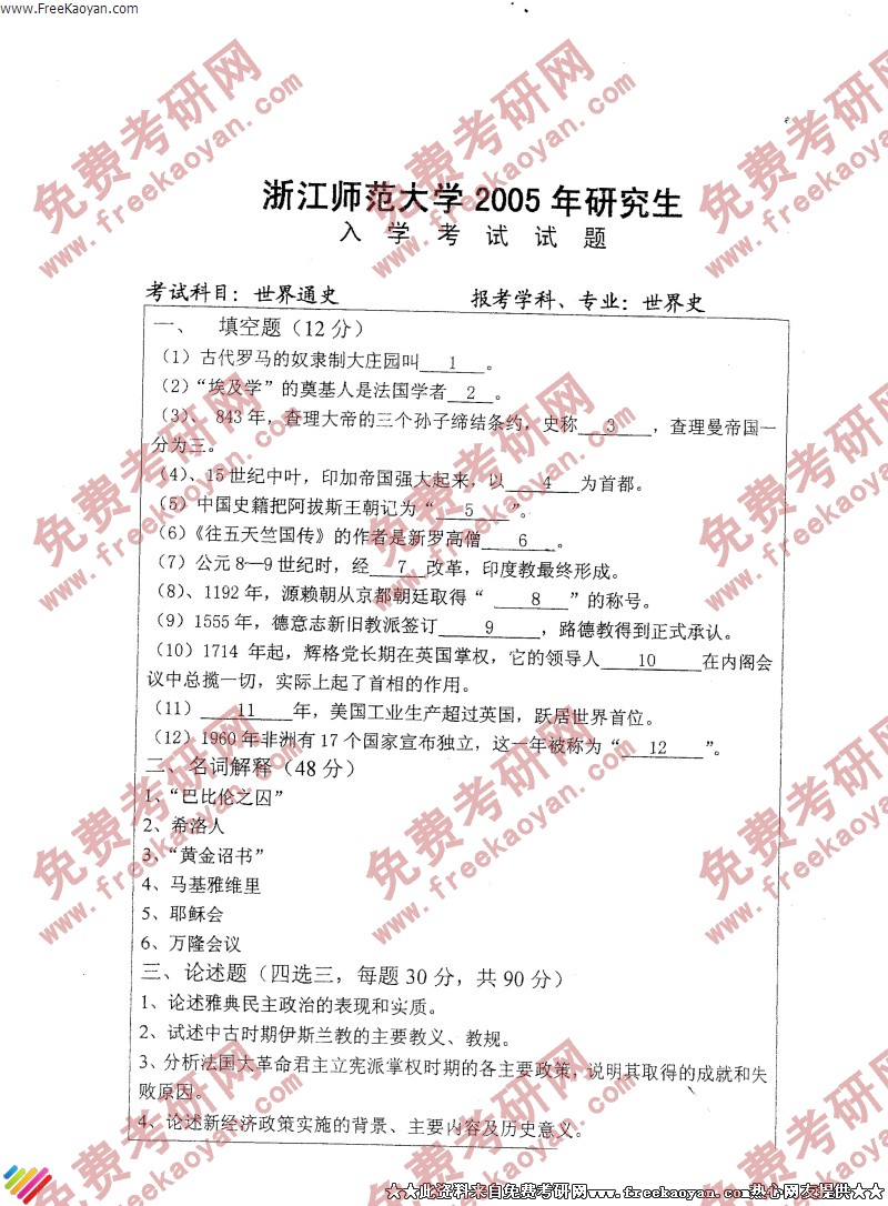 专业课考研经验 本站小编 FreeKaoyan 2018-01-22浙江师范大学2005年考研真题-历史教学综合基础