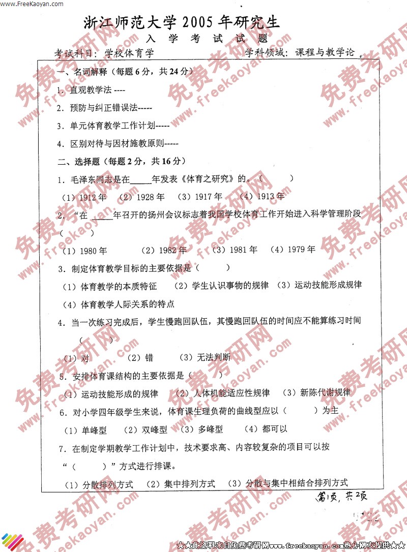 专业课考研经验 本站小编 FreeKaoyan 2018-01-22浙江师范大学2005年考研真题-思想政治教育学