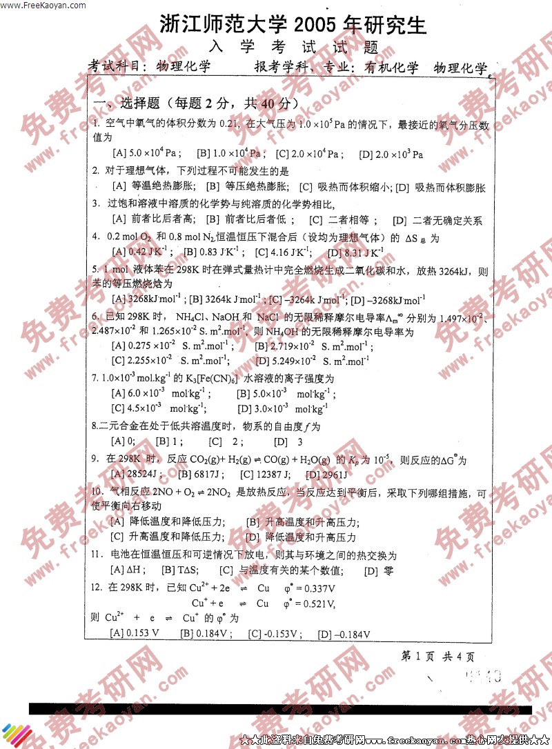 浙江师范大学2005年考研真题-物理化学
