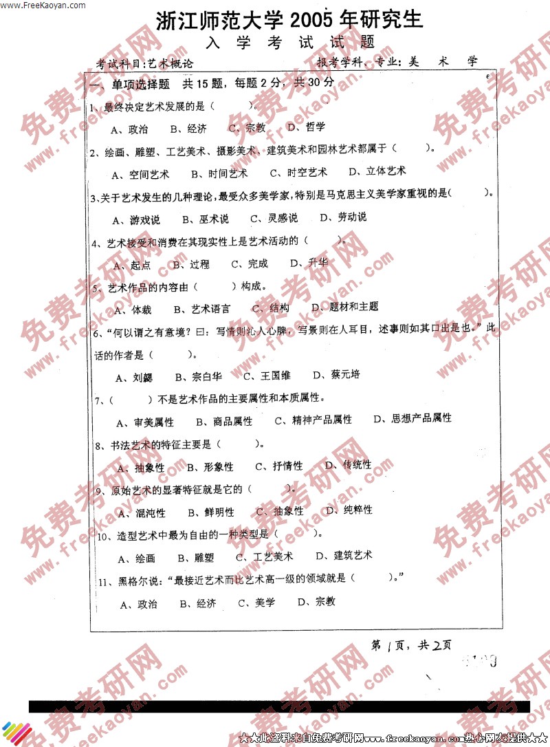 专业课考研经验 本站小编 FreeKaoyan 2018-01-22浙江师范大学2005年考研真题-文艺理论
