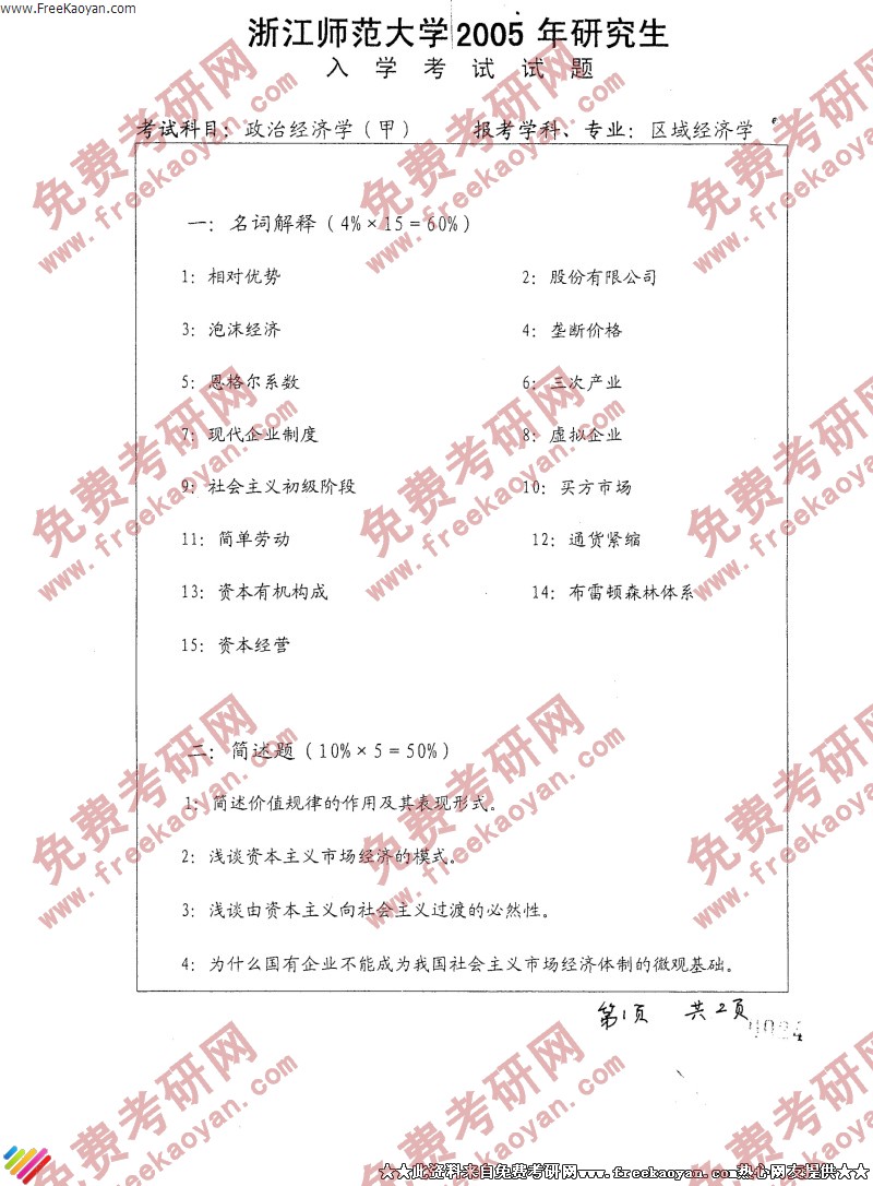 专业课考研经验 本站小编 FreeKaoyan 2018-01-22浙江师范大学2005年考研真题-政治经济学
