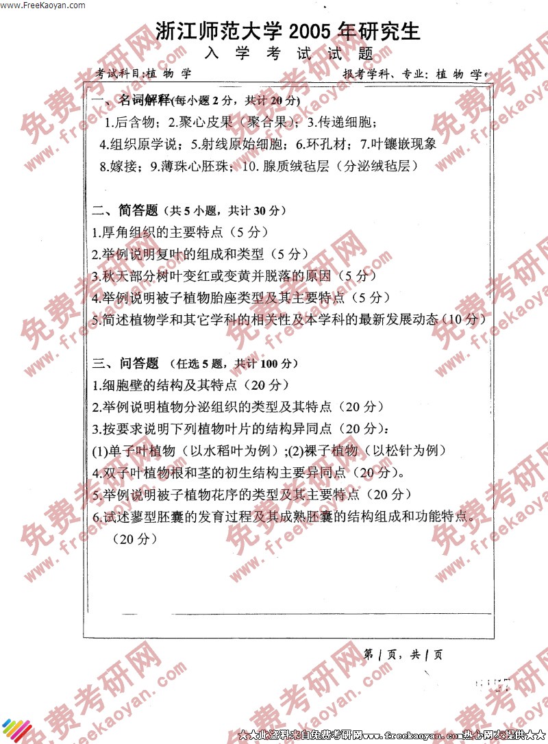 专业课考研经验 本站小编 FreeKaoyan 2018-01-22浙江师范大学2005年考研真题-植物生理学