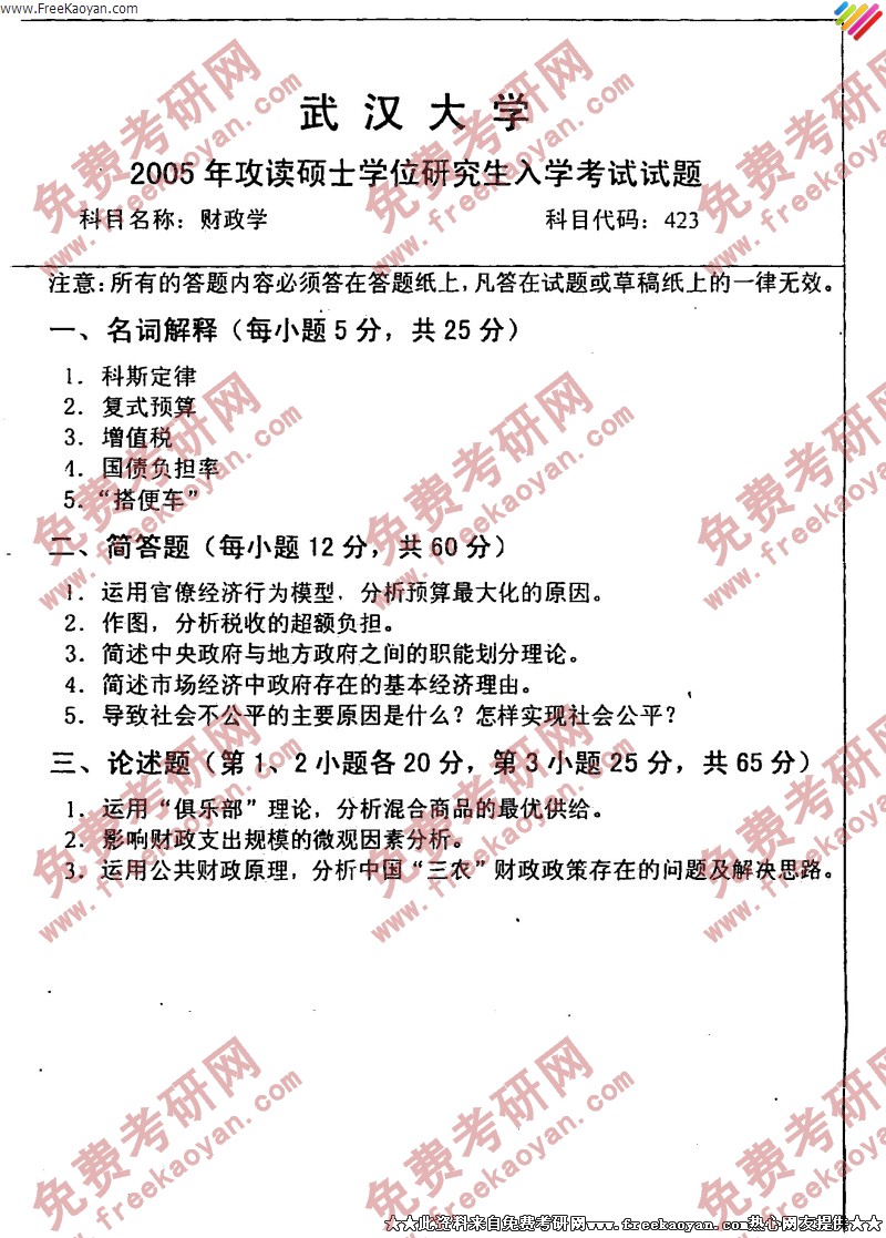 武汉大学2005年考研真题-财政学