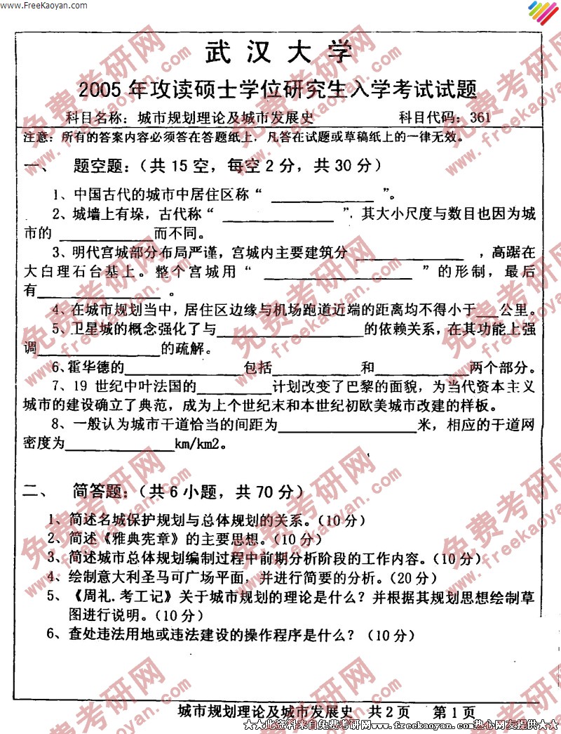武汉大学2005年考研真题-城市规划理论及城市发展史