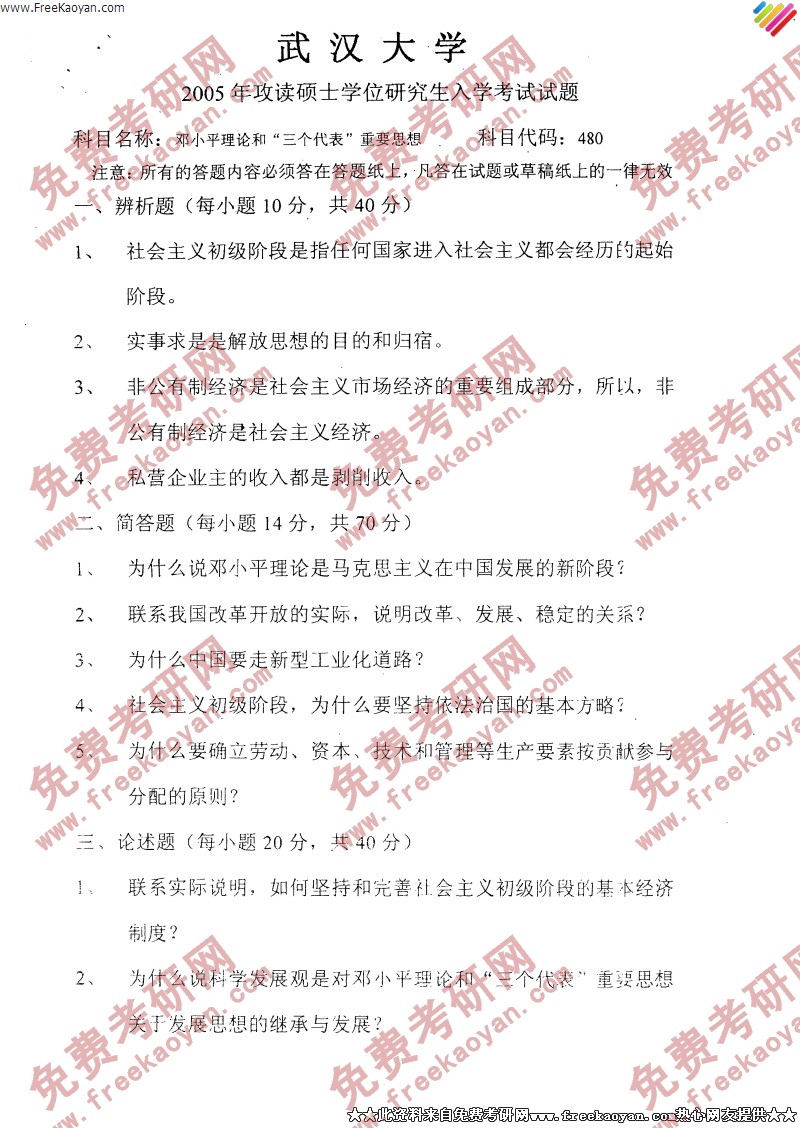 武汉大学2005年考研真题-邓小平理论和“三个代表”重要思想