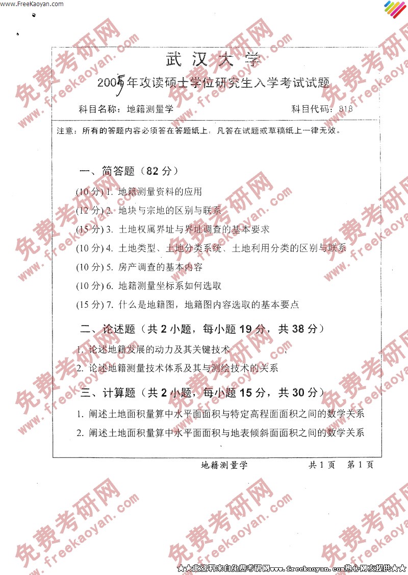 武汉大学2005年考研真题-地籍测量学