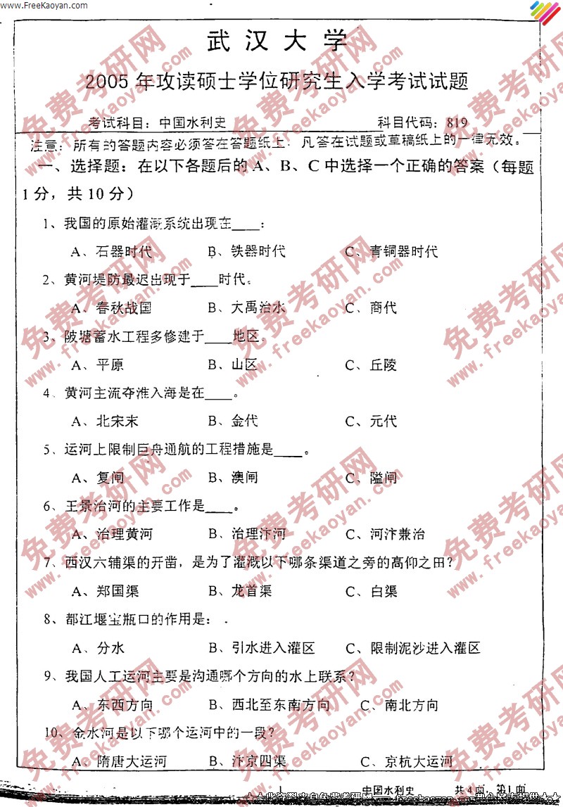 专业课考研经验 本站小编 FreeKaoyan 2018-01-22武汉大学2005年考研真题-典籍与文化综合知识