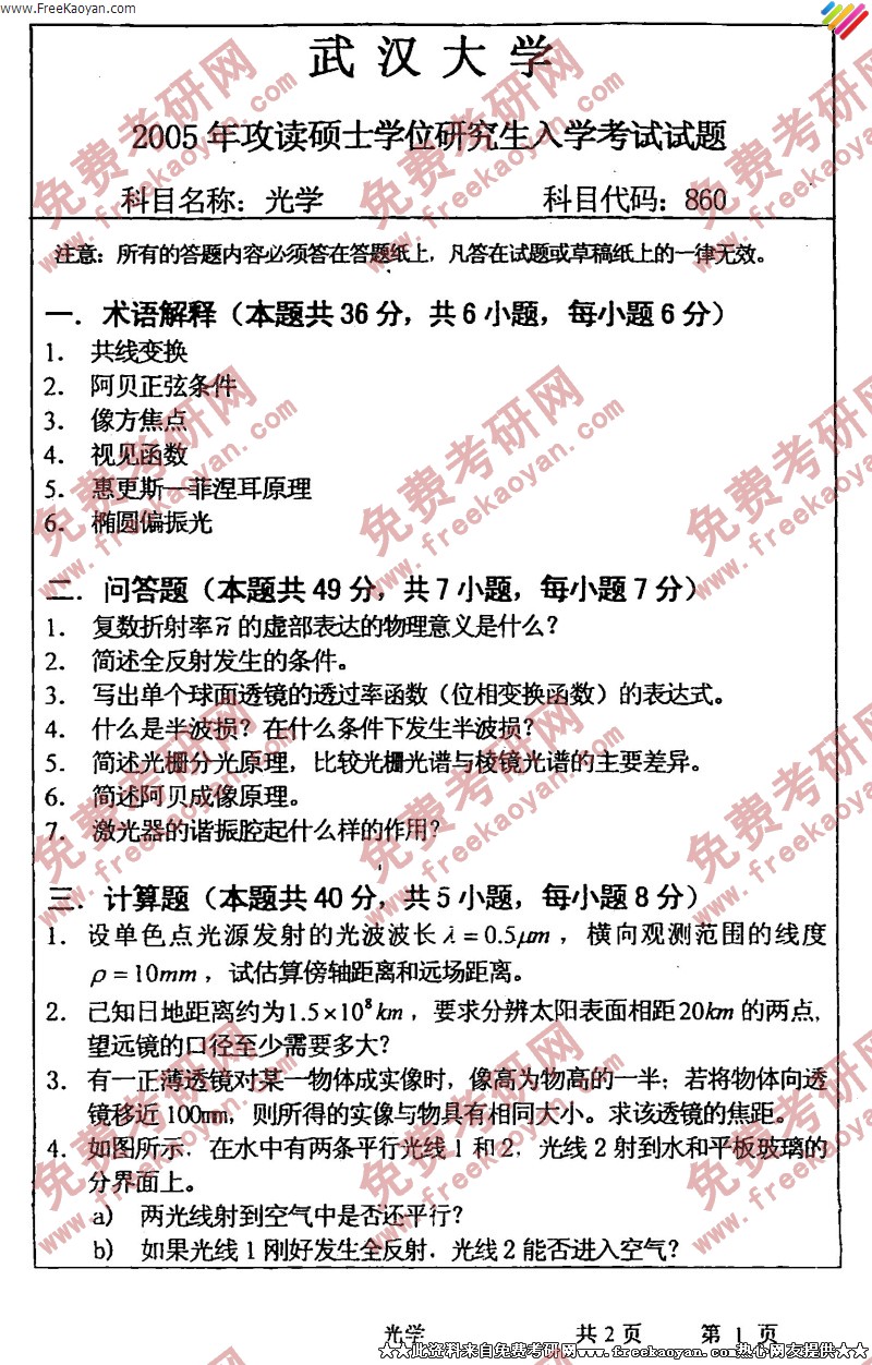 专业课考研经验 本站小编 FreeKaoyan 2018-01-22武汉大学2005年考研真题-分析化学