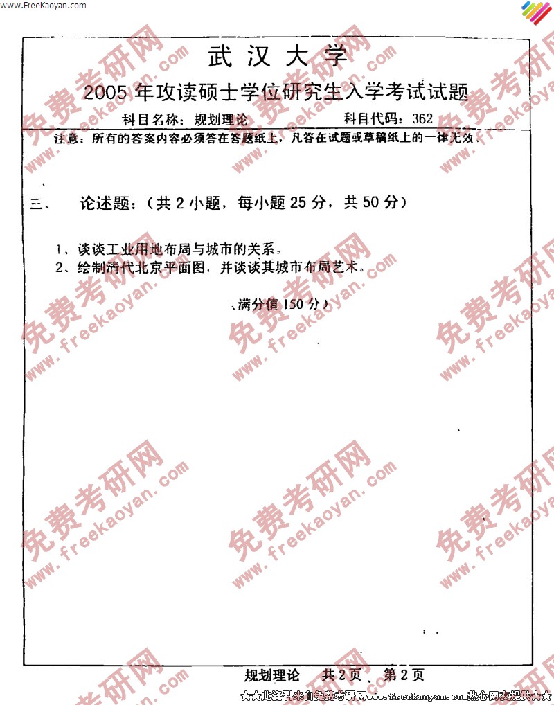 专业课考研经验 本站小编 FreeKaoyan 2018-01-22武汉大学2005年考研真题-地图学