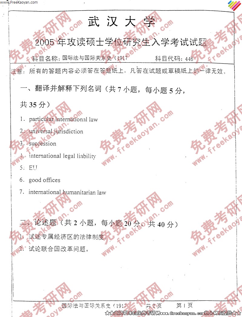 专业课考研经验 本站小编 FreeKaoyan 2018-01-22武汉大学2005年考研真题-国际法与法理学