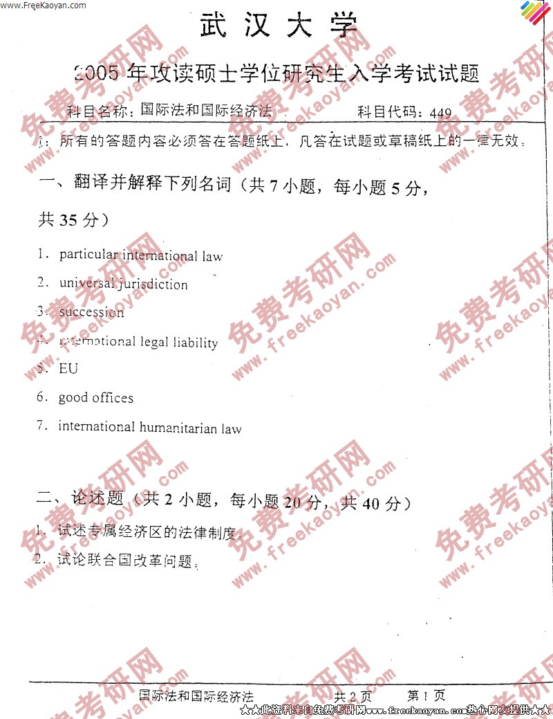 专业课考研经验 本站小编 FreeKaoyan 2018-01-22武汉大学2005年考研真题-国际法与法理学