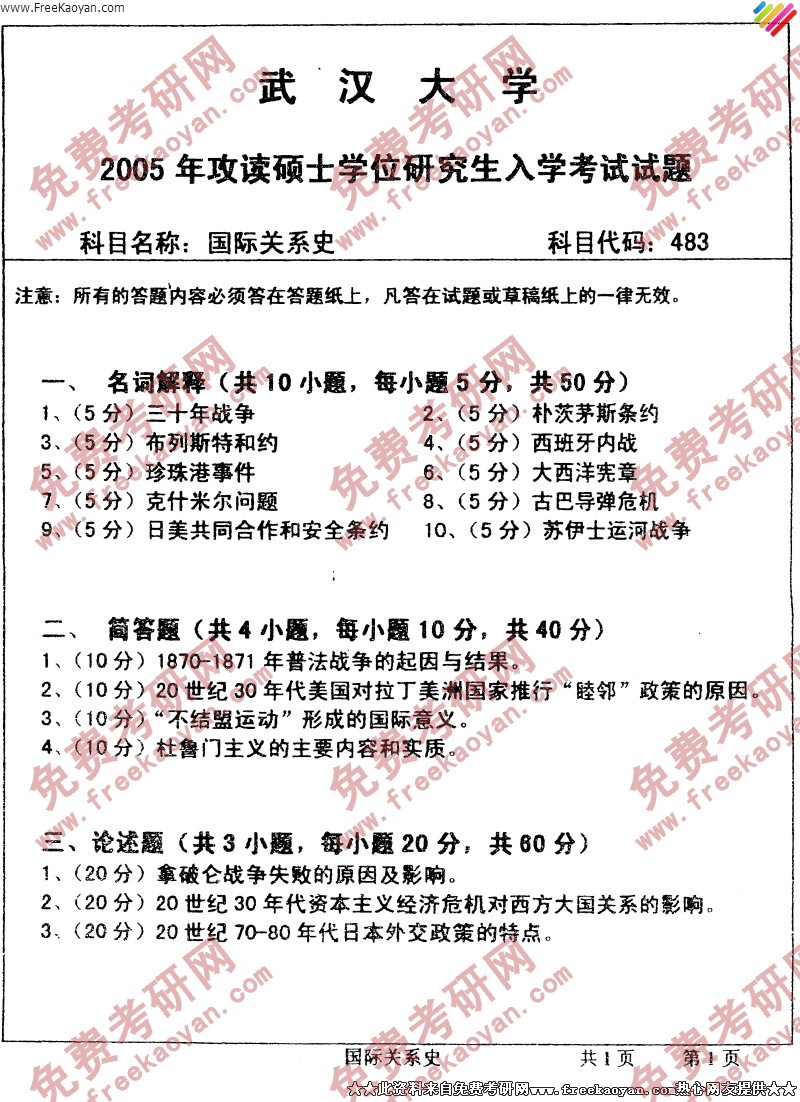 专业课考研经验 本站小编 FreeKaoyan 2018-01-22武汉大学2005年考研真题-国际法与国际关系史