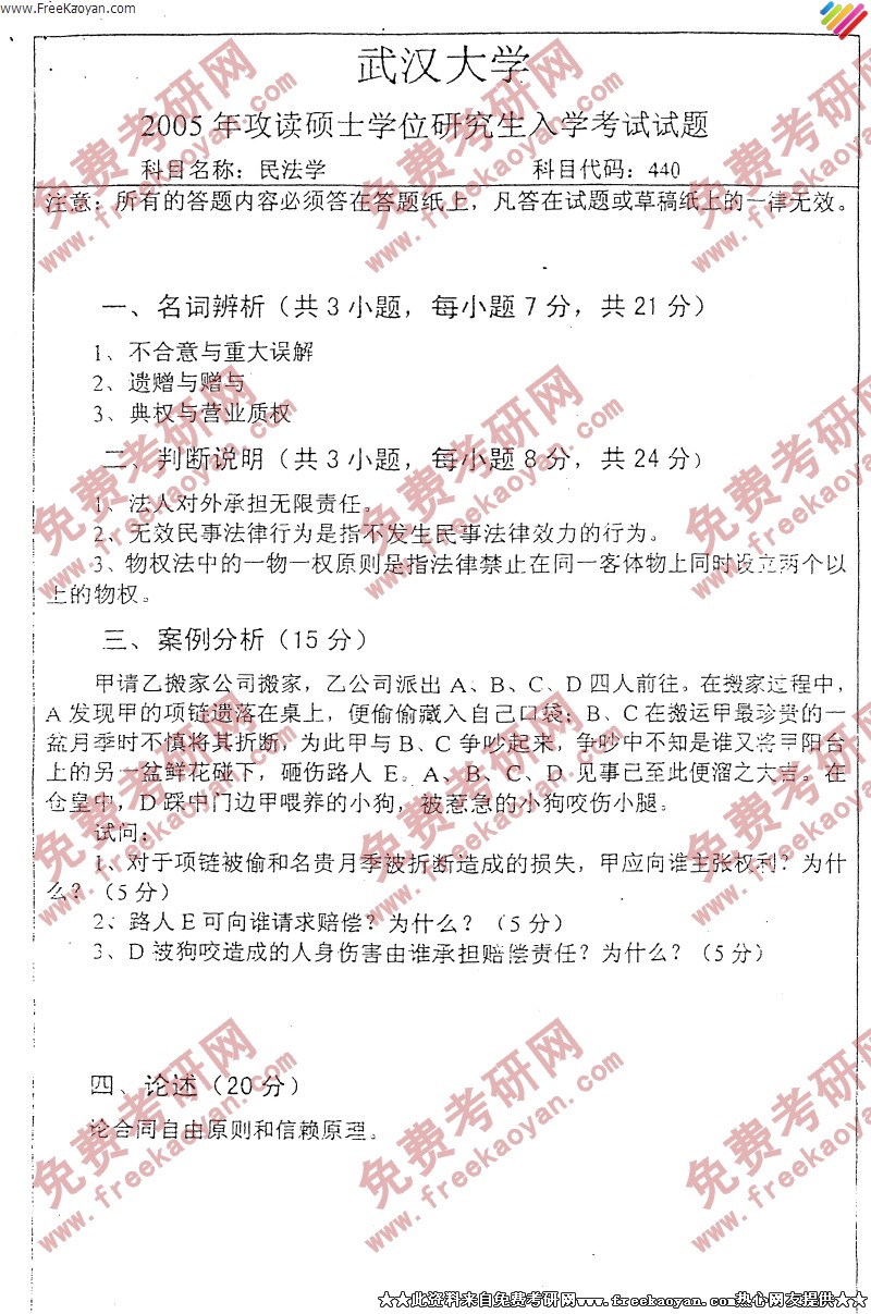 武汉大学2005年考研真题-民法学