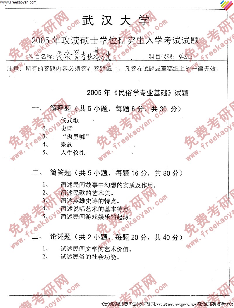 专业课考研经验 本站小编 FreeKaoyan 2018-01-22武汉大学2005年考研真题-经典释读与文化史