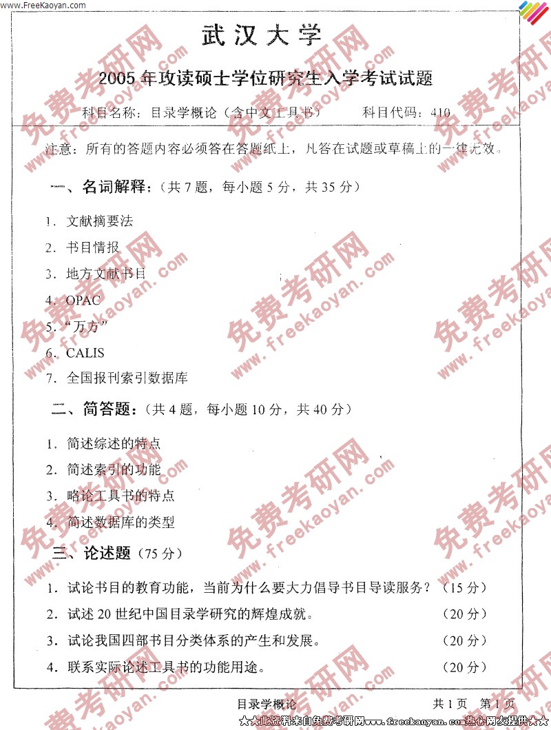 武汉大学2005年考研真题-目录学概论
