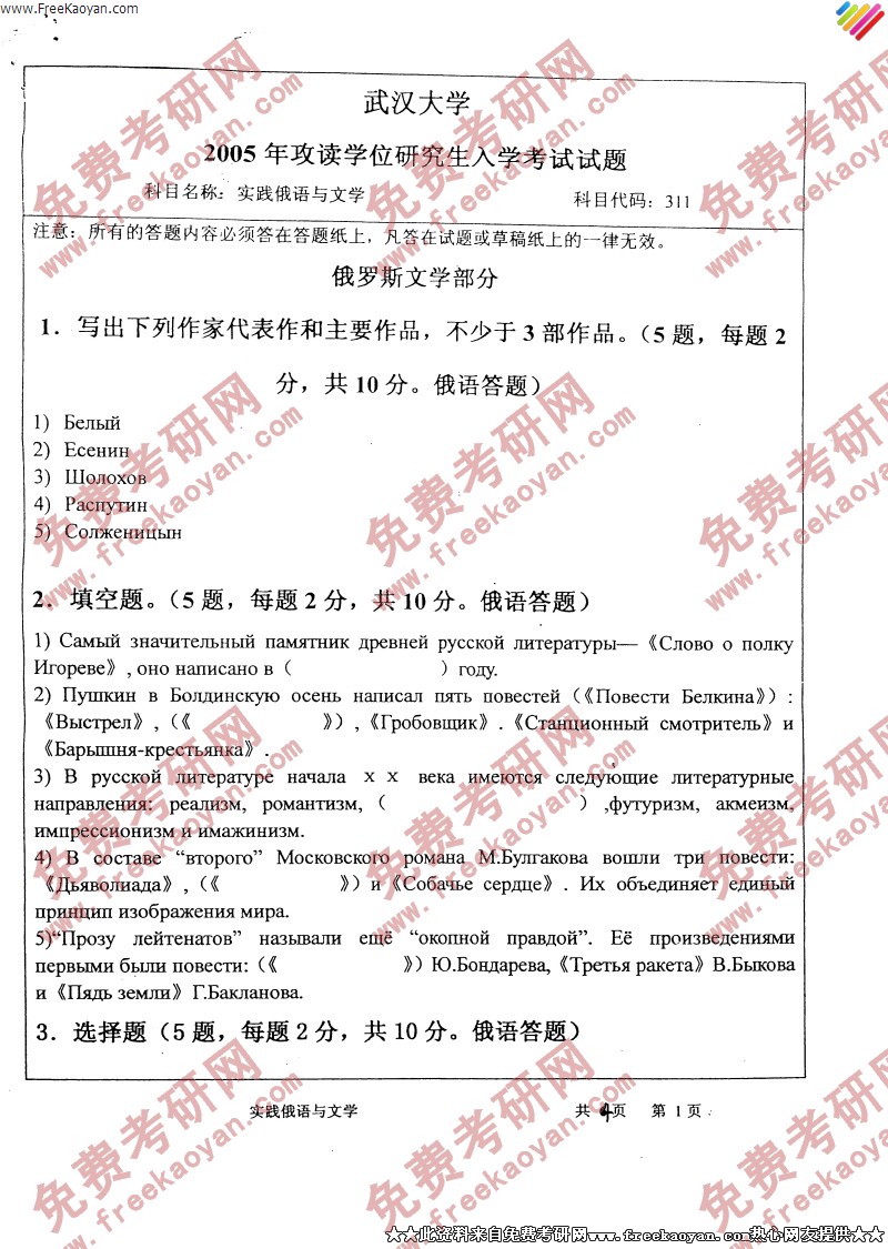 武汉大学2005年考研真题-实践俄语与文学