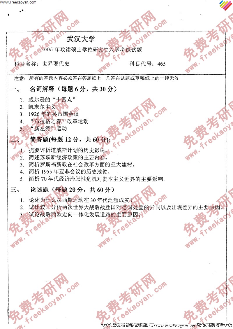 专业课考研经验 本站小编 FreeKaoyan 2018-01-22武汉大学2005年考研真题-世界近代史