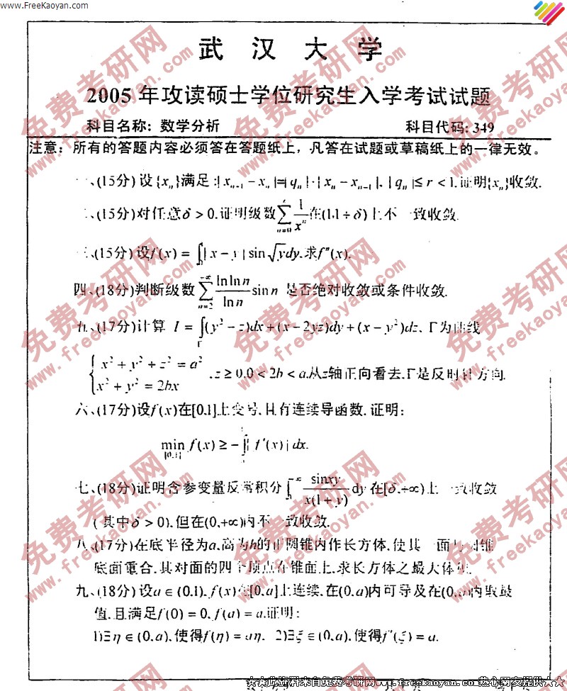 专业课考研经验 本站小编 FreeKaoyan 2018-01-22武汉大学2005年考研真题-普通化学与高分子化学