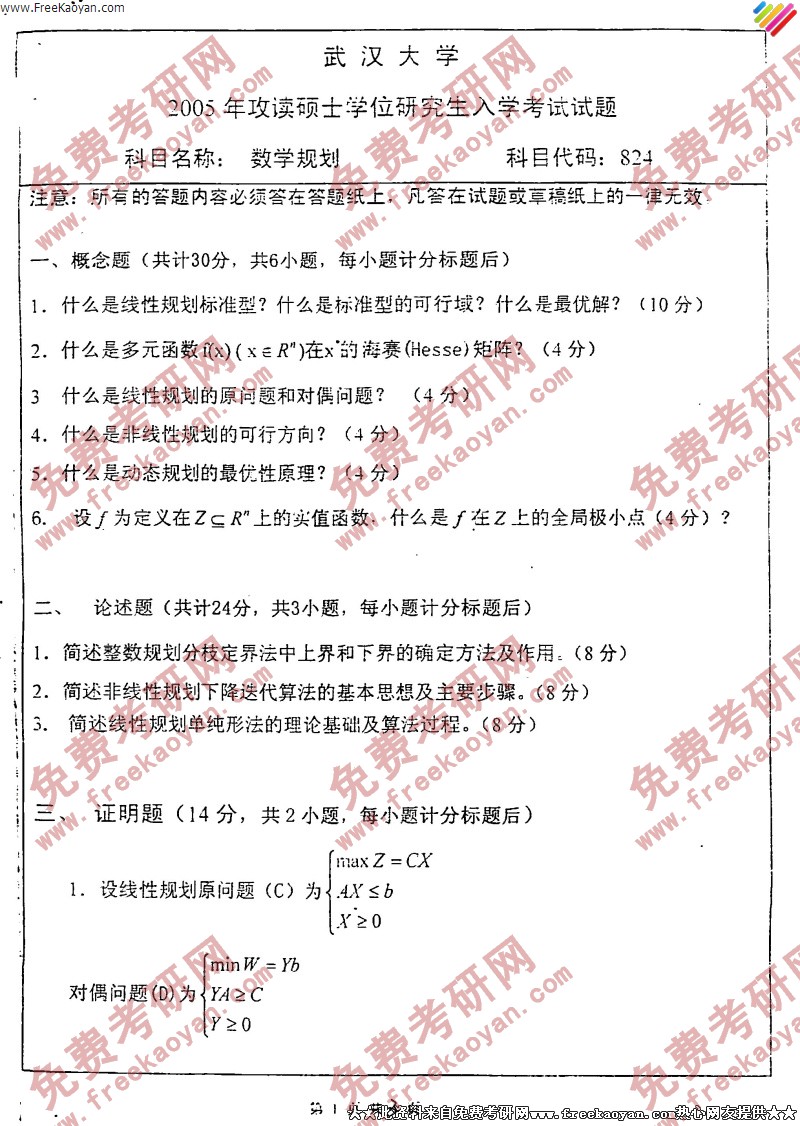 武汉大学2005年考研真题-数学规划
