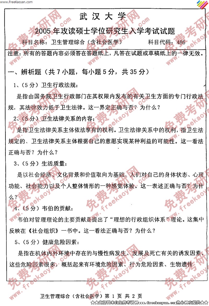 武汉大学2005年考研真题-卫生管理综合(汉社会医学)