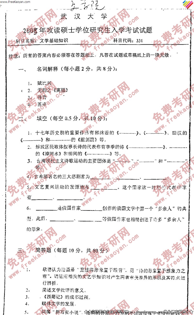 专业课考研经验 本站小编 FreeKaoyan 2018-01-22武汉大学2005年考研真题-实践俄语与文学
