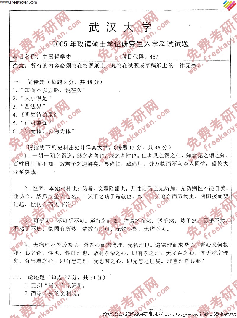 专业课考研经验 本站小编 FreeKaoyan 2018-01-22武汉大学2005年考研真题-中国古代史