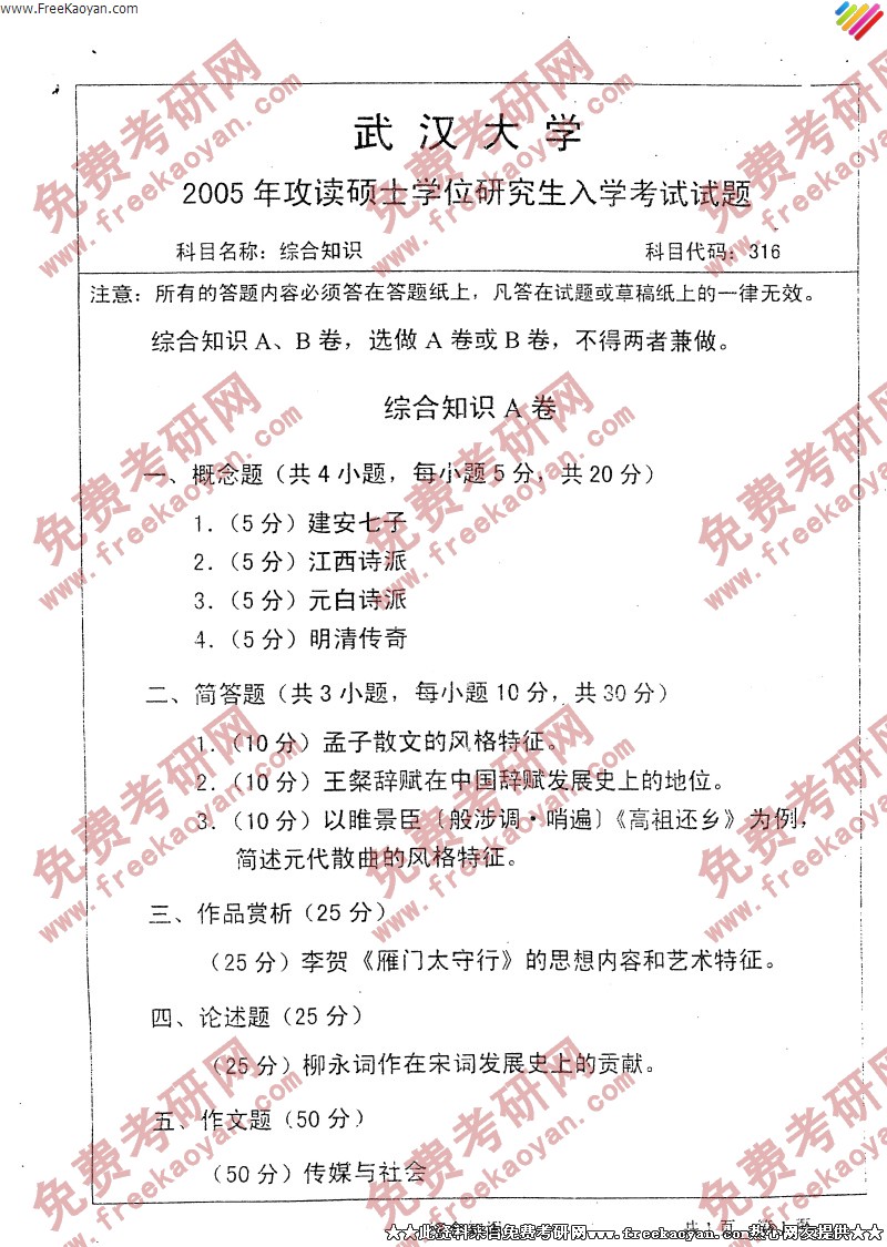 专业课考研经验 本站小编 FreeKaoyan 2018-01-22武汉大学2005年考研真题-综合知识-2005